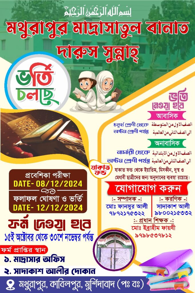 আপনি একজন আদর্শ পিতা-মাতা হিসেবে সন্তানের শিক্ষার দায়িত্ব পালন করা আপনার অন্যতম কর্তব্য। সঠিক শিক্ষা ও সঠিক মূল্যবোধে গড়ে উঠলে আপনার সন্তান ভবিষ্যতে সমাজে একটি ইতিবাচক অবদান রাখতে সক্ষম হবে। আপনার কন্যা একদিন সমাজ ও জাতি গঠনের কারিগর হিসেবে দাঁড়াবে, আর এজন্য তাদের গুণবতী, পরদর্শী ও সঠিক শিক্ষায় শিক্ষিত করে তোলার জন্য আমাদের মাদ্রাসা একটি আদর্শ প্রতিষ্ঠান। Mathurapur Madrashatul Banat Darus Sunnah তে আমরা প্রতিটি শিশুকে সামাজিক মূল্যবোধের আলোকে সুন্দর ভবিষ্যৎ গড়ে তুলতে সহায়তা করি। আমাদের সাথে যোগ দিন একটি উন্নত আগামী নির্মাণে।